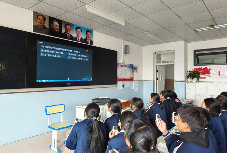 在重慶西大附中星辰學(xué)校的一節(jié)英語課上,學(xué)生人手一個(gè)“遙控器”用來答題互動(dòng)。據(jù)了解,這個(gè)工具叫做智能語音答題器,可以通過軟件和教學(xué)大屏直接實(shí)現(xiàn)信號(hào)互通,當(dāng)老師在大屏上下發(fā)單詞或句子朗讀任務(wù)時(shí),學(xué)生只需要通過智能語音答題器收音,就可以得到實(shí)時(shí)的口語評(píng)分,全班每位學(xué)生的朗讀數(shù)據(jù)也會(huì)在任務(wù)結(jié)束后立刻輸送至教學(xué)大屏,生成個(gè)人和班級(jí)整體的朗讀報(bào)告,教師根據(jù)朗讀報(bào)告精準(zhǔn)點(diǎn)評(píng),針對(duì)性攻克薄弱點(diǎn),可謂事半功倍。